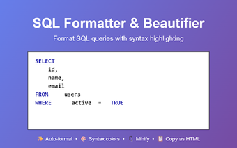 SQL Formatter & Beautifier är ett kostnadsfritt tillägg för webbläsaren Chrome som erbjuder användarna en smidig lösning för att formatera och försköna SQL-frågor. Med stöd för flera databashanteringssystem, inklusive PostgreSQL, MySQL, T-SQL och Oracle, gör detta verktyg det enkelt att förbättra läsbarheten av SQL-kod genom att tillämpa syntaxmarkering och korrekt indragning. Användare kan kopiera och klistra in sina SQL-frågor för att snabbt få dem formaterade enligt standarder.